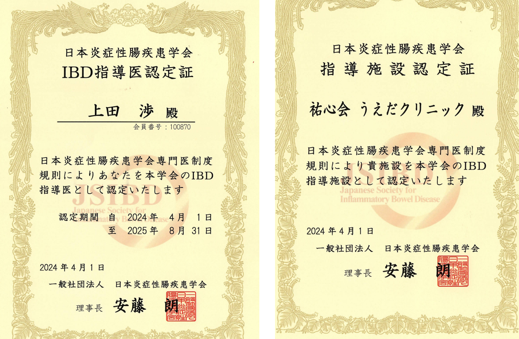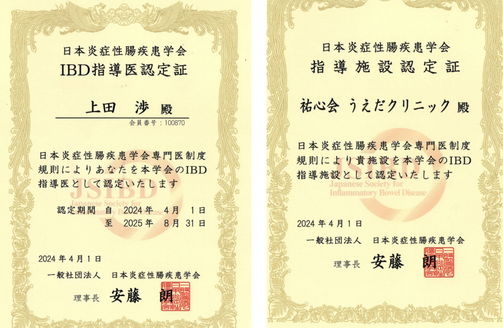 当院の上田院長は、30年にわたりIBD診療に従事してきました。その間多数の学会発表や研究会で難治例や非典型例などのIBD症例(潰瘍性大腸炎、クローン病など)を診療して参りました。このたびIBD指導施設に当院を選ばれました。また院長の上田はIBD専門医 指導医にも認定されました。今後も今まで培ってきた経験を糧にIBD診療に尽力したいと思います。